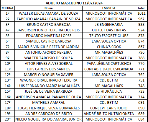 Já no masculino, com disputa acirrada, os três primeiros lugares foram definidos da seguinte forma: Walter Lucas, da Microboot Informática, na primeira posição, seguido de Fabrício Amaral, também da Microboot Informática em segundo e Bruno Castro, da JB Engenharia na terceira colocação.