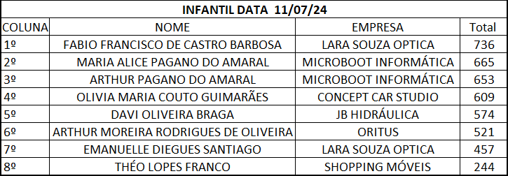 Na soma total, os campeões foram definidos. Na categoria infantil, quem teve maior regularidade foi Fábio Castro, da Lara Souza Óptica, levando o troféu de primeiro lugar. Em segundo, Maria Alice, da Microboot ficou com o taça e em terceiro, Arthur Pagano, também representando a Microboot Informática.