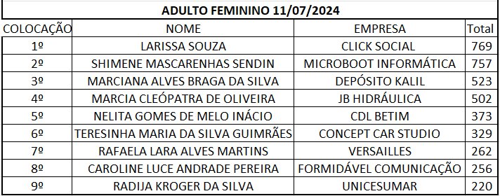 As mulheres deram um show de competição e o resultado final ficou assim: Larissa Souza, da Click Social em primeiro; Shimene Mascarenhas, da Microboot Informática, em segundo e Marciana Alves, do Depósito Kalil, em terceiro lugar.